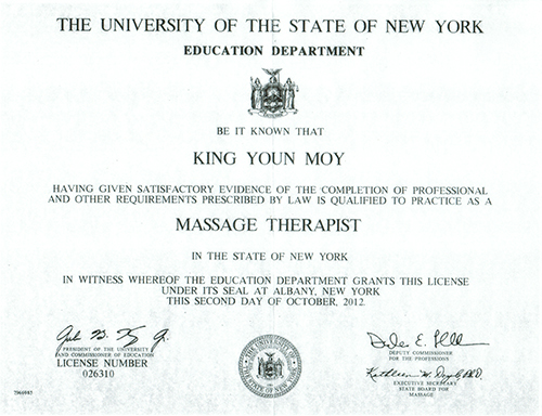 To verify my license status go to http://www.op.nysed.gov/opsearches.htm under profession select massage therapist and enter my license number: 026310 then click search.